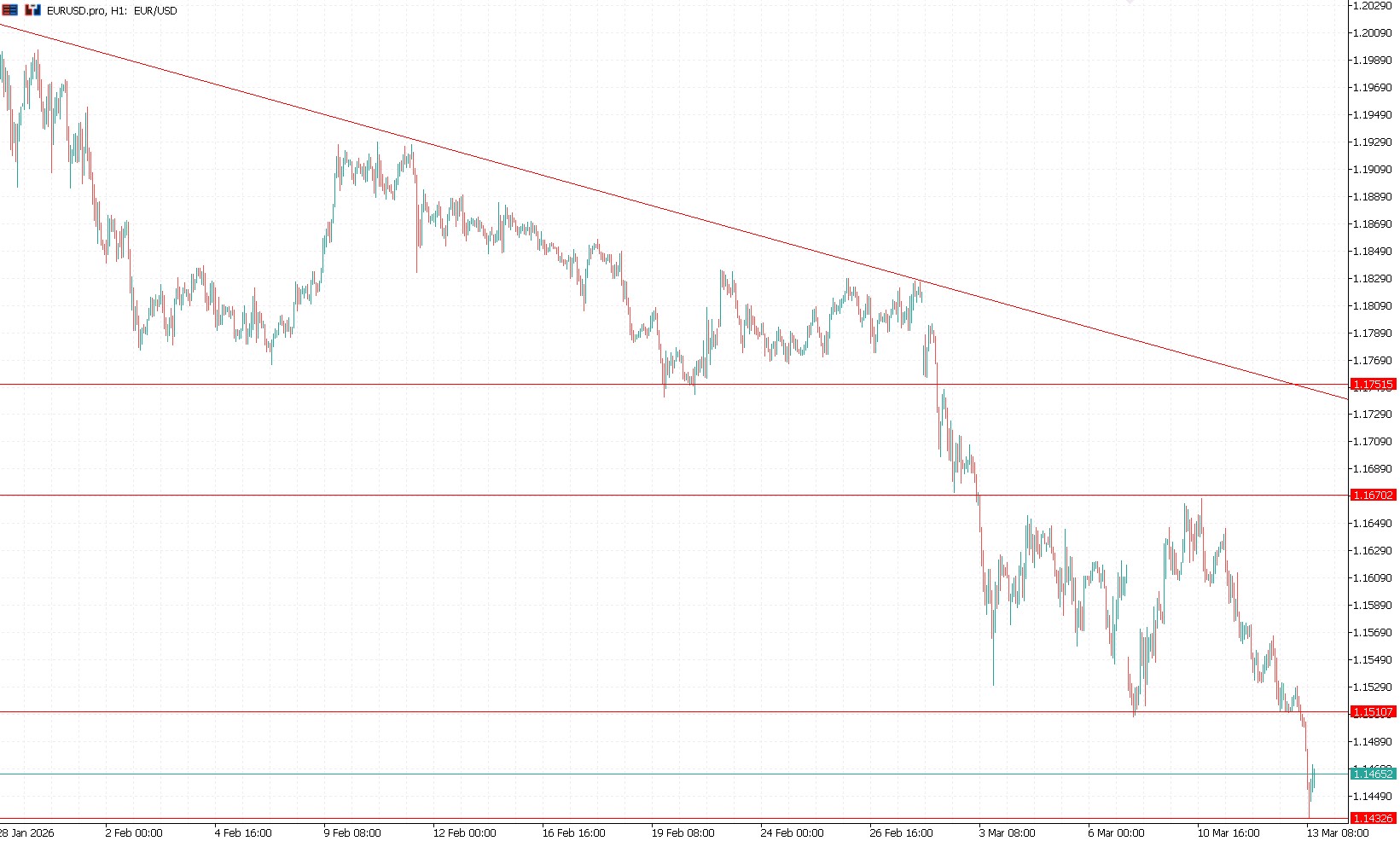 Trend spadkowy rozpędził się w marcu na głównej parze walutowej świata. Ostatniej sesji lutego notowania eurodolara oscylowały przy 1,183 USD. Dziś o poranku lokalnym minimum było 1,144 USD. Oznacza to istotne umocnienie waluty zza oceanu względem unijnej. Powodem ruchu jest strach, który kieruje kapitał do bezpiecznych przystani. Paniczna ucieczka do dolara to efekt ataku USA i Izraela na Iran, po którym niepewność rozlała się na forex. Wraz z pierwszym uderzeniem notowania EUR/USD osunęły się z 1,183 USD do 1,167 USD. Kolejne wieści o eskalacji konfliktu z ubiegłego tygodnia łamały istotne wsparcia sprowadzając wykres do 1,151 USD. Gdy tylko przychodziła chwila wytchnienia od negatywnych informacji kurs odreagowywał – próby powrotu na 1,167 USD. Były to jednak krótkotrwałe ulgi, które szybko ulatniały się wraz z doniesieniami o zaostrzeniu konfliktu. Z informacji podawanych przez media próżno szukać argumentów stojących za wczesnym zakończeniem wojny. USA nadal atakuje, Teheran odpowiada, a cieśnina Ormuz, nie dosyć że jest praktycznie wyłączona, to być może właśnie zostaje zaminowana. Ponadto Trump głośno mówi, że aktualne konsekwencje ataku są akceptowalnym kosztem w porównaniu do przyzwolenia na posiadanie bomby atomowej przez Islamską Republikę Iranu. Takie połączenie sprowadziło dziś kurs EUR/USD do poziomów, które ostatni raz widziane były w połowie 2025 roku. Jeżeli spadki będą kontynuowane, notowania natrafią na kolejne wsparcie przy 1,14 USD. W przypadku jeszcze mocniejszego spadku możliwy jest nawet atak na 1,127 USD. Natomiast łagodzenie konfliktu wiązałoby się z powrotem do 1,151 USD, a potem 1,167 USD. Co równie warte uwagi to fakt, że w marcu rynki zupełnie ignorują dane makroekonomiczne ze strefy euro czy USA. Wpływu na notowania eurodolara nie mają nawet odczyty inflacyjne, które tym razem nie interesują inwestorów, gdyż wpływ wojny na dynamikę cen widoczny będzie dopiero w kolejnych miesiącach.