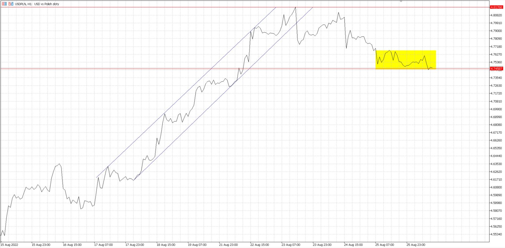 Sytuacja techniczna na wykresie USD/PLN w tym tygodniu uległa zmianie na korzyść rodzimej waluty. Co do faktu, że początek tygodnia dla złotego był słaby, nie ma żadnych wątpliwości. Rozpędzony dolar poruszał się wzdłuż stromego kanału wzrostowego. We wtorek na USD/PLN doszliśmy do poziomu 4,8176 PLN. W mediach pojawiały się głosy, jakobyśmy zmierzali w kierunku nowych rekordów. Przypomnę, że w połowie lipca dolar w stosunku do rodzimej waluty był najdroższy w historii i kosztował powyżej 4,83 PLN. Mimo słabego sentymentu dookoła złotego, we wtorek wieczorem polskiemu orłowi udało się wyjść ze wcześniej wspomnianego kanału wzrostowego. Zapewne miało to również związek z publikacją słabych danych PMI dla przemysłu i usług w USA, które przyczyniły się do osłabienia “zielonego”. W takich sytuacjach rodzima waluta zawsze koreluje odwrotnie do amerykańskiej waluty. Od środy na wykresie USD/PLN widać systematyczne umacnianie się złotego. W piątek zeszliśmy nawet do poziomu około 4,745 PLN za jednego dolara.