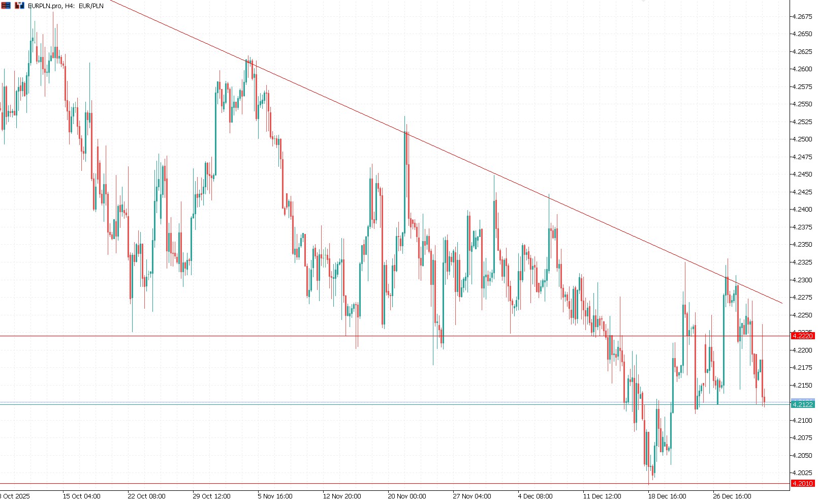 Ostatnie dni grudnia przyniosły delikatny ruch w górę na EUR/PLN nieco powyżej poziomu 4,23, ale Nowy Rok to powrót w okolice 4,21. Złoty znów pokazuje siłę, tym bardziej w kontekście mocniejszego USD dzisiaj. Aktualnie sytuacja techniczna jest więc dość jasna, a scenariusz testowania poziomu 4,20 cały czas jak najbardziej realny. Czy jednak będzie to większe umocnienie? Tu pojawiają się wątpliwości. Przede wszystkim spodziewane jest jeszcze dwukrotne cięcie stóp przez RPP, i to w pierwszej połowie 2026 r. Jeśli wspomnimy o dzisiejszym odczycie inflacji za grudzień – 2,4% r/r, czyli zdecydowanie poniżej ścieżki prognozowanej przez NBP – ten scenariusz jest tym bardziej prawdopodobny. Niekorzystnym czynnikiem wciąż pozostaje jednak brak przełomu (zakończenie wojny bądź rozejm) w Ukrainie. Mimo to siłą PLN powinna być polska gospodarka, która ma się znów wyróżniać na arenie europejskiej, a PKB ma przebić poziomy z 2025 r. Dzisiejszy słabszy odczyt PMI (48,5 pkt) jest już ósmym z rzędu poniżej poziomu 50 pkt, co nieco psuje perspektywy, ale – patrząc na wskaźnik przyszłej produkcji w ciągu kolejnych 12 miesięcy – widzimy o wiele korzystniejszy obraz. Technicznie więc silnym wsparciem będzie poziom 4,20, jeśli dojdzie do mniej oczekiwanego ruchu w górę, to oporem będzie linia trendu spadkowego.